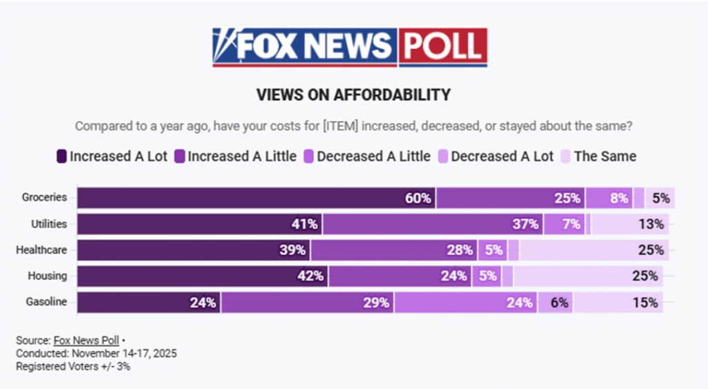 A Fox News poll (Nov. 14-17) found that 85% of respondents said grocery prices are higher than a year ago, with 60% saying they’ve “increased a lot.” Substantial majorities also said the prices of utilities (78%), healthcare (67%) and housing (66%) were up, as you can see from the graph below. Even majorities of Republicans agree with Democrats and Independents that prices have gone up.