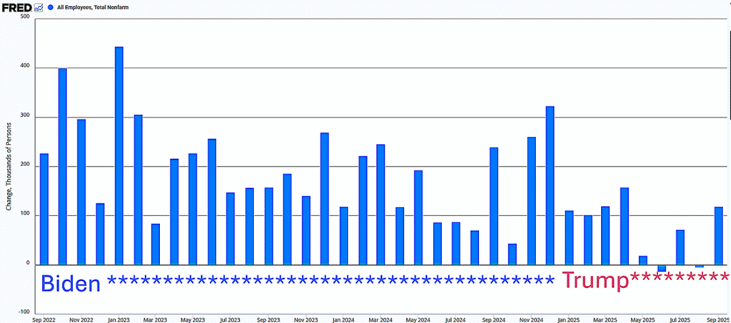 As you can plainly see, monthly job growth has been modest since Trump came into office in January. Biden had many months where new jobs exceeded 200,000, and sometimes exceeded 300,000. On the other hand, new jobs under Trump are hovering around 100,000. Job growth was tiny in May, negative in June, about 75,000 in July, and negative in August. Given this trend, it’s easy to see why economists only expected around 50,000 new jobs in September. The 119,000 number for that month was indeed double what was expected; but this number is hardly a triumph. New jobs numbers during Biden’s term tower over Trump’s. Leavitt lies when she implies Biden’s numbers were disastrous.