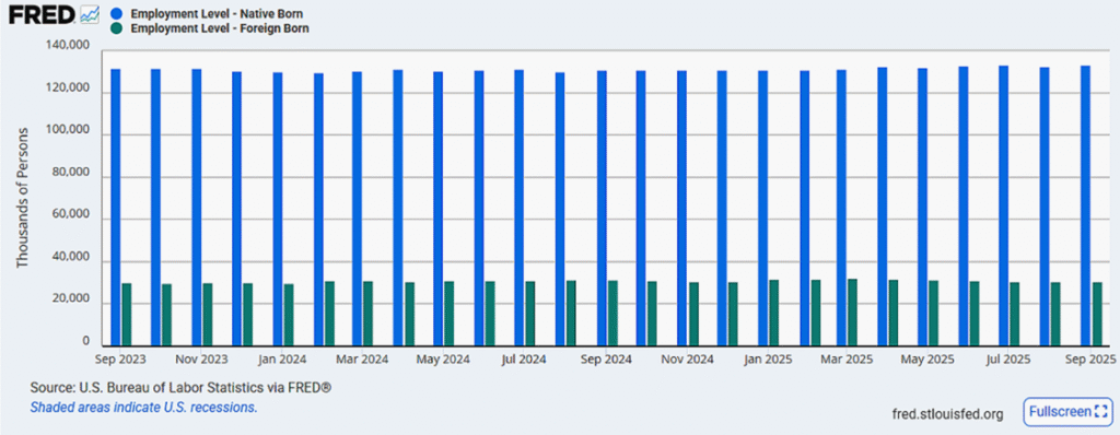 Leavitt also makes a big deal about these new jobs going to American-born workers rather than “illegal aliens.” The trouble is, the statics she cites are “foreign born” workers, rather than “illegal aliens.” This is blatantly misleading, as at least three-fourths of foreign born workers are in the country legally She makes it appear that there was a huge swing in American born workers. For contrast, let me display FRED data going back to September 2023, showing the numbers of native born and foreign born workers in America. Not quite the huge swing she paints, is it?