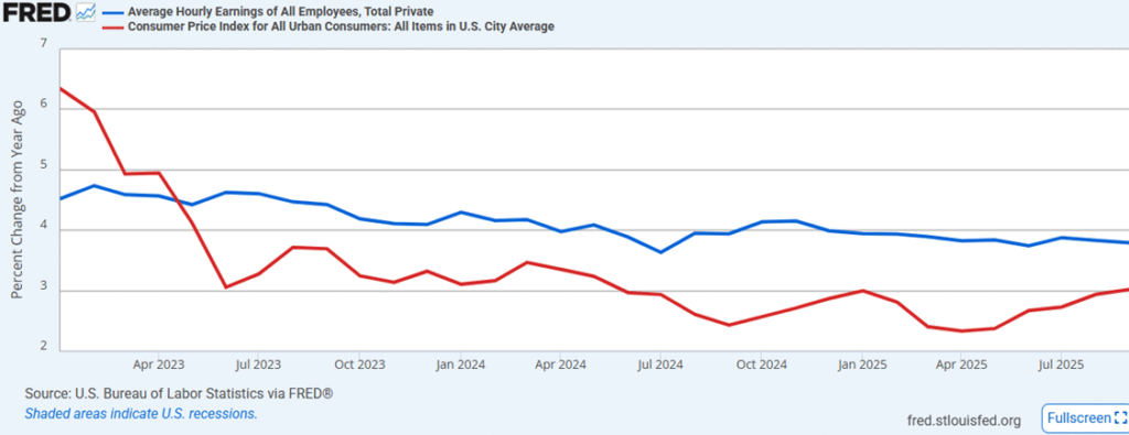 Below I’m showing FRED data on the percent change in average hourly earnings compared to the rate of inflation (CPI). As you can plainly see, since around May of 2023—more than 2.5 years—wages have gone up more than the rate of inflation. Without saying so, Leavitt apparently cherry picks a period time during Biden’s term when wage gains lagged inflation (e.g., summer of 2022). But it’s very misleading to imply this was the case for Biden’s entire term.