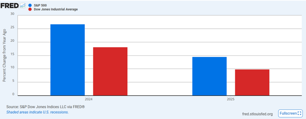 STOCK MARKET: The stock market in Trump’s first year (2025) did not outperform the stock market in 2024. Both years produced good returns, 2024 was better than 2025. See for yourself at University of Wisconsin, Steven’s Point, and CNBC. See also this graph I made using the FRED stock market chart wizard: