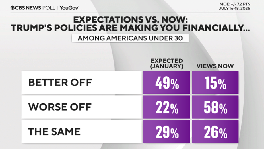In summary, concerns about Trump’s handling of inflation and prices, jobs and the economy, climate change and the environment, and health care were all influential in causing those 18-29 to downgrade Trump’s job approval. A recent CBS News report especially focuses on how this age group feels worse off financially under Trump (see the graphic below). They feel the President is paying too much attention to tariffs and not enough attention to inflation, prices, and the economy.