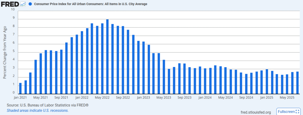 It will be a minor miracle if the rate of inflation comes down to around 2% within the next 12-14 months (i.e., before the November 2026 midterm election). I reviewed numerous inflation forecasts, including those from the Federal Reserve. Most forecasts see inflation remaining in the 2.5% to 3% range for 2025 and 2026. Inflation has been stable or ticking up slightly in recent months. Trump’s tariffs and the expected lowering of interest rates by the Federal Reserve will increase inflationary pressures.
